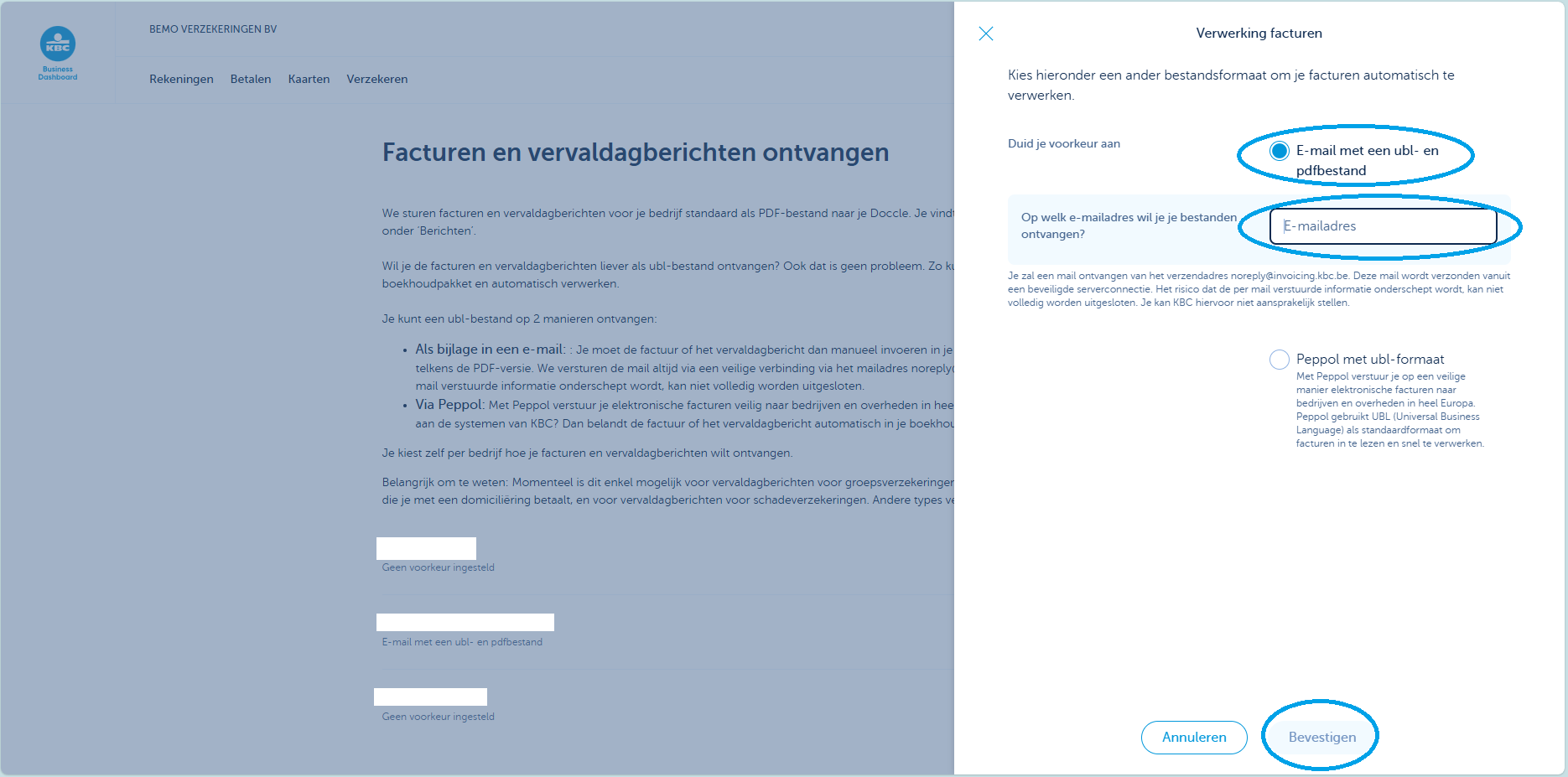 Duid het bolletje "E-mail met een ubl- en pdfbestand" aan en vul je e-mailadres in. Klik vervolgens onderaan op "Bevestigen".